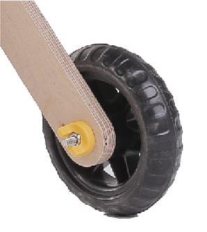 Die Räder sind aus EVA (Ehylen-Vinylacetat), einem geschäumten Werkstoff. Er zeichnet sich durch seine besonders weichen und elastischen Eigenschaften aus, die denen von Gummi ähneln. Dabei sind die Räder jedoch leichter, geräuscharmer und zeigen weniger Abrieb. Das bedeutet, dass die Räder auch in Innenräumen eingesetzt werden können und darüber hinaus viele Jahre verwendet werden können. Aber auch draußen sind die Räder im Einsatz. Der Puppenwagen aus Holz ist damit in jeder Umgebung wendig und flexibel zu nutzen.